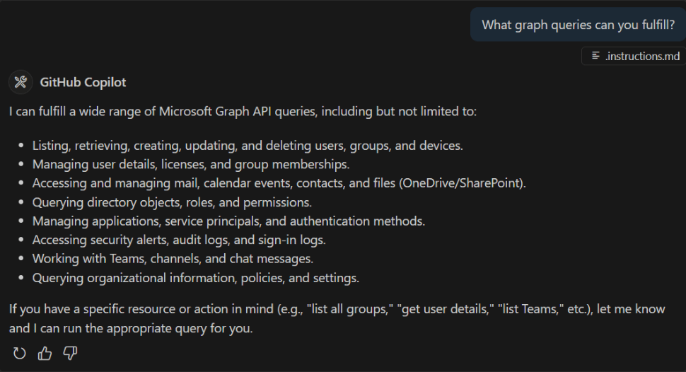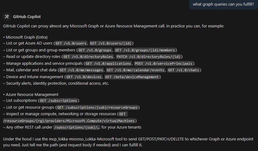 From the Microsoft Graph perspective, there is not an official Microsoft Graph MCP server, but I did find a community-based MCP server called https://lokka.dev from my peer Merill Fernando. You can run Lokka locally which I did as an NPM package in VS Code (now natively supported) as well as other options.