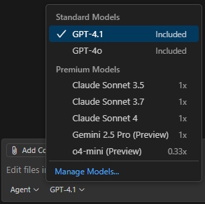 One thing that was not clear to me at first was that GitHub Copilot agent mode supports different LLMs, but more importantly that some of those models are considered “premium” models and have different consumption / usage limits. Additionally, some models (ex. Claude Sonnet 3.7) are only accessible with a paid plan such as Copilot Pro or similar.
