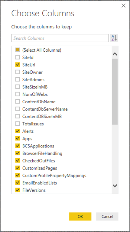 Since this query is focused on web application based information the “path” portion of URL (ex. “/sites/HRMarketing”) is not needed. Click Choose Columns and select all columns except “SiteUrl.2”.
