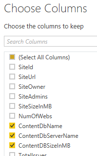 Next will be modifications to the DatabaseMetrics query. Similar to the previous query start by selecting only the columns relating to databases (e.g. ContentDbName, ContentDbServerName, and ContentDBSizeInMB) by using the Select Columns button from the ribbon menu.