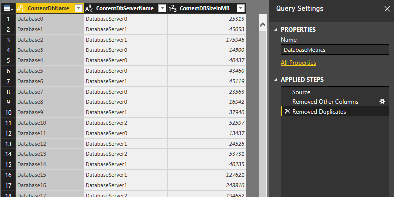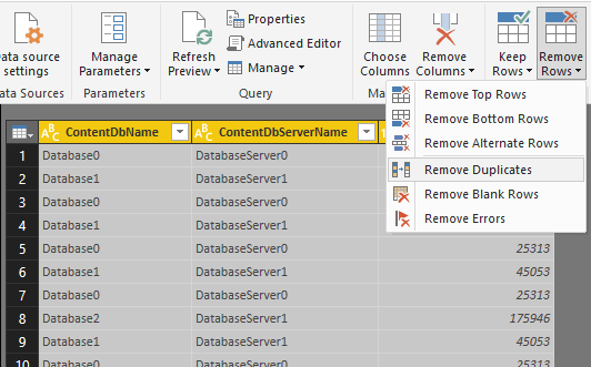 There will likely be duplicate rows in the result because each row in the original CSV corresponds to a single site collection and each content database can contain 1 or more site collections. In order to clean up the duplicate rows select all three columns and then (with columns still selected) click Remove Rows –> Remove Duplicates from the ribbon menu.