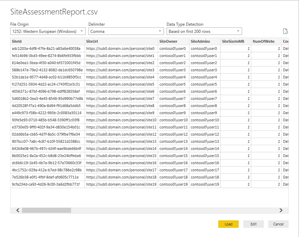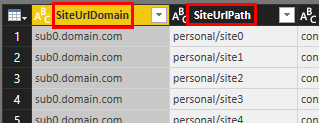 After the columns have been chosen rename the “SiteUrl.1” column to “SiteUrlDomain”. The data should look similar to the following at this point.