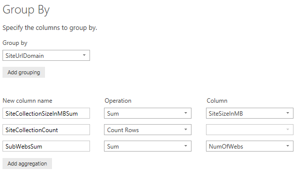 The final modification for the WebApplicationMetrics query will be to group the data by multiple aggregations. Select the SiteUrlDomain column and click Group By in the ribbon menu. Make sure that SiteUrlDomain is selected for the top Group By box. Proceed to add additional aggregations for three columns: