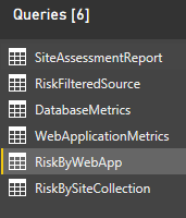 Create three references from the source data load query (SiteAssessmentSummary) and rename the referenced queries appropriately. In this example I named them RiskFilteredSource, DatabaseMetrics, and WebApplicationMetrics (respectively the 3 boxes in the 2nd row on my hierarchy diagram above).