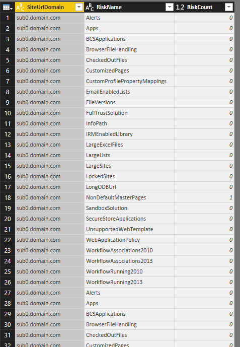 The resulting query will have SiteUrlDomain, Attribute, and Value for columns. Rename Attribute and Value to RiskName and RiskCount respectively.