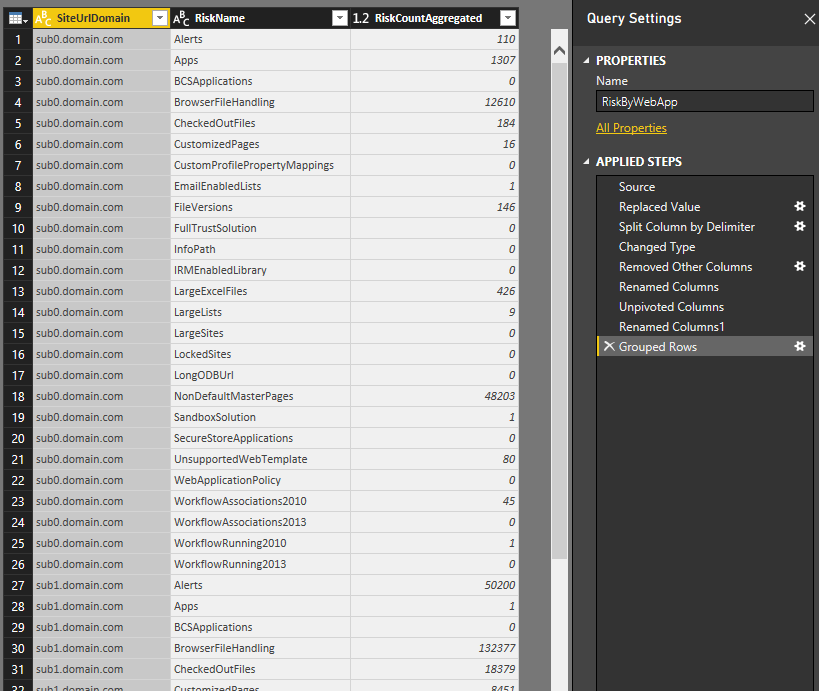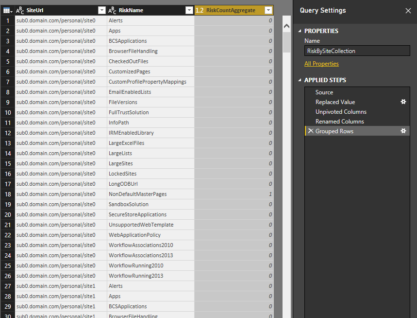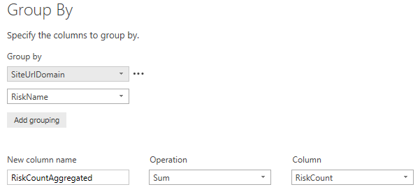 - Grouped Rows – group by SiteUrl and RiskName, sum RiskCount into RiskCountAggregate.