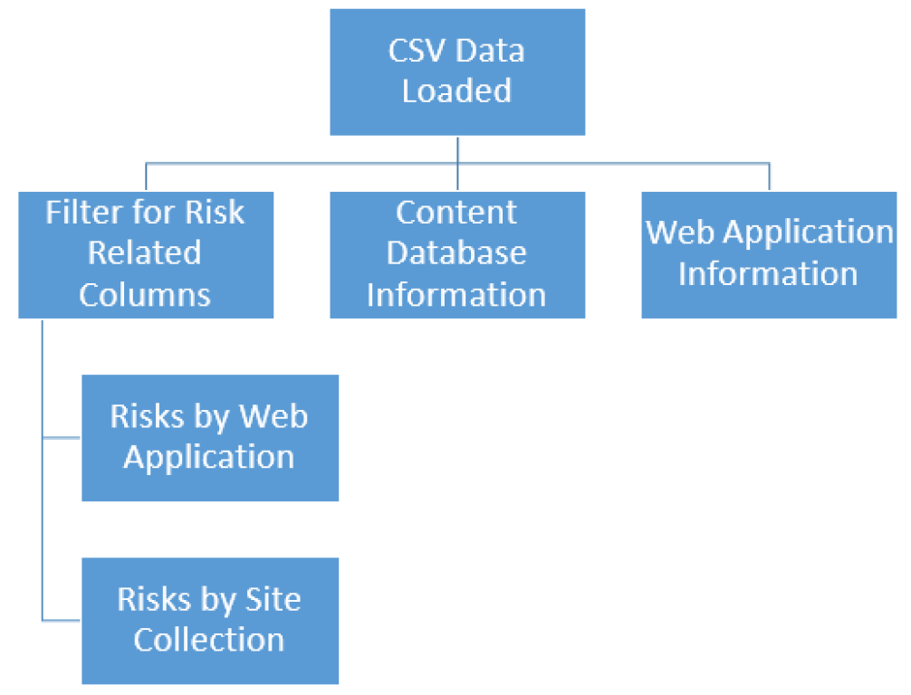 Power BI has a nice set of features that allows taking a set of data, making some changes, and then creating a reference (shallow copy) or duplicate (deep copy) that altered set of data. As such I loaded the CSV data and then referenced that data into 3 separate queries, 1 of which was further split into multiple queries for risk data by web application and by site collection. The following are example steps to accomplish this.
